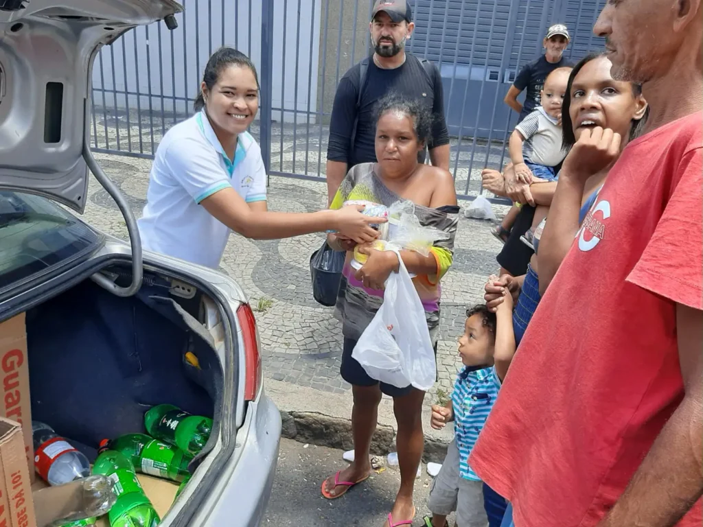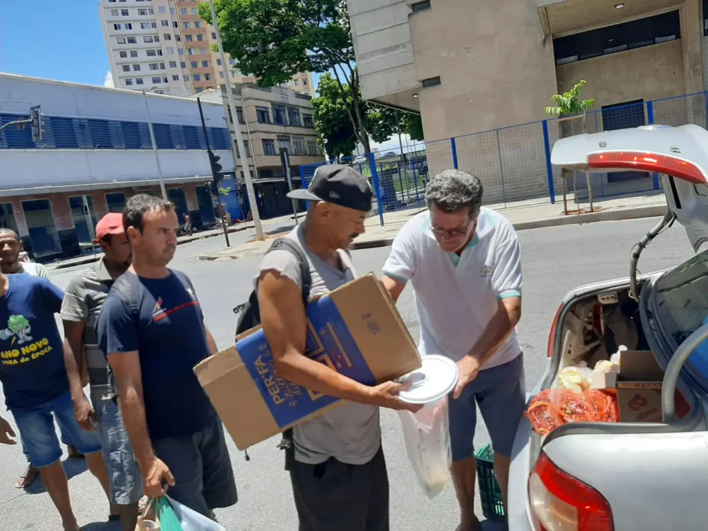 A distribuição do alimento nas ruas conta com grupos de voluntários que percorrem a cidade e também entregam água potável, cobertores, roupas e sapatos.