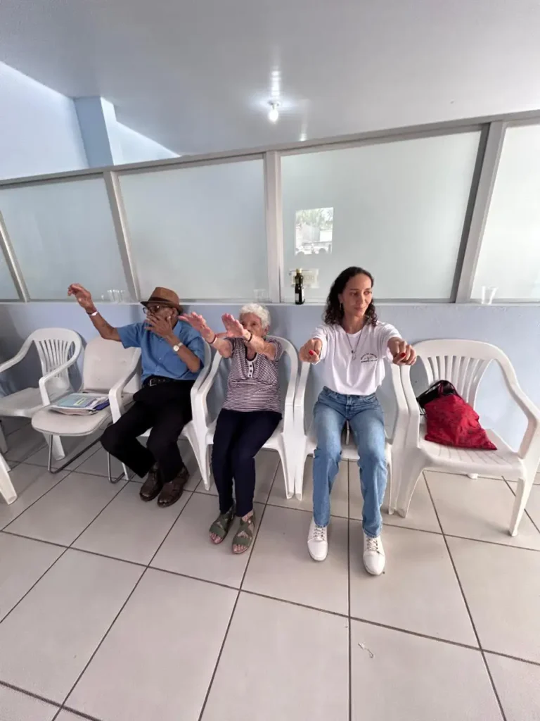 No encontro do dia 21 de março, a fisioterapeuta conduziu uma atividade que integrou percepção corporal, coordenação motora e estímulo cognitivo.
