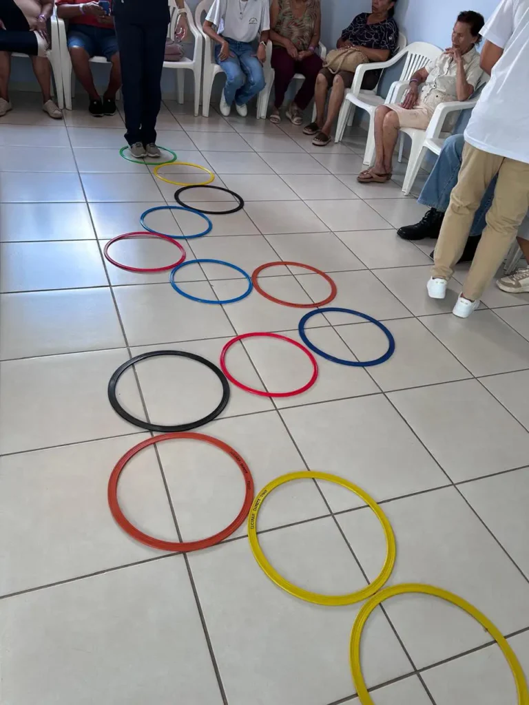 Durante a dinâmica, os participantes precisavam pular em arcos coloridos seguindo comandos de cores, exigindo atenção, memória imediata e coordenação.